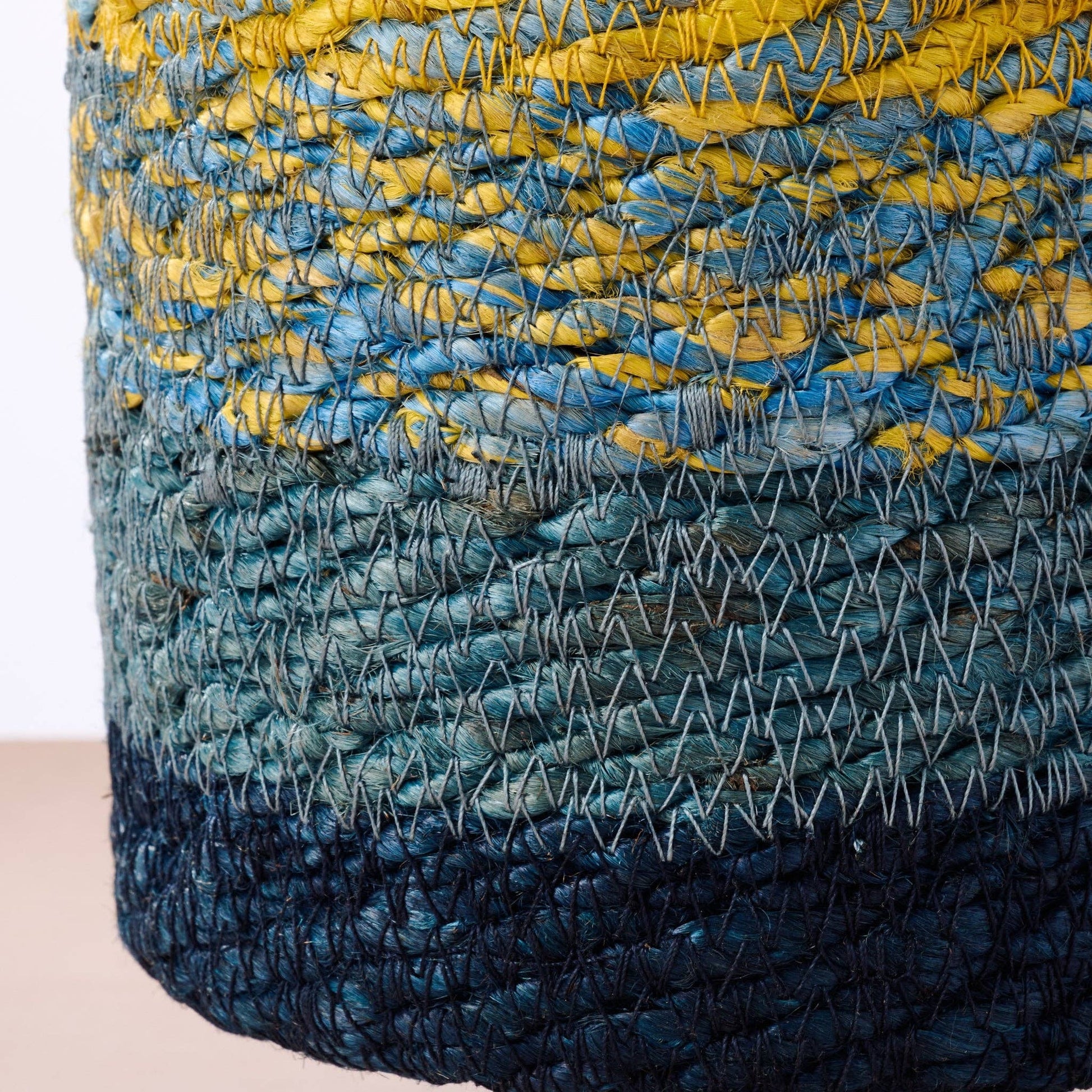 Add style and vibrancy to your space with this naturally beautiful plant hanger in blue, yellow and natural. Made from natural jute, the sturdy construction and three-color design add a pop of color while keeping your plant secure. A great addition to any home! Handcrafted in Bangladesh.
