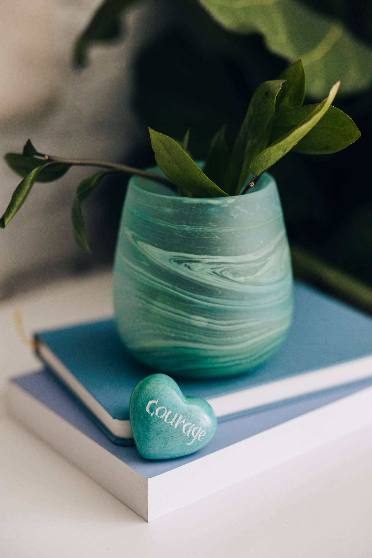 Each piece is handcrafted; shades of aqua and green, swirl pattern will vary. 3.5Dx3.5H inches