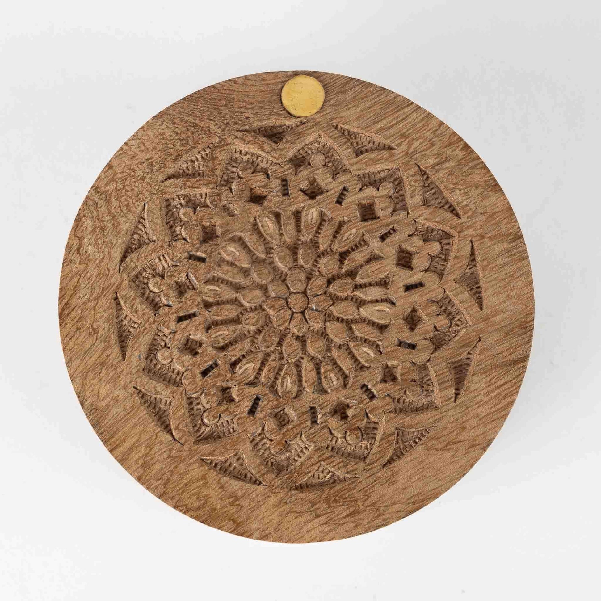 Organize and store your treasured belongings in the Khazaana Mango Wood Keepsake Box. Crafted with high-quality mango wood, this handcrafted box features a unique swivel lid carved with an exquisite mandala and a soft, block-printed cotton lining. Perfect for keeping your precious items safe and secure. Handcrafted in Moradabad, India, this item is exclusively available at Ten Thousand Villages.
