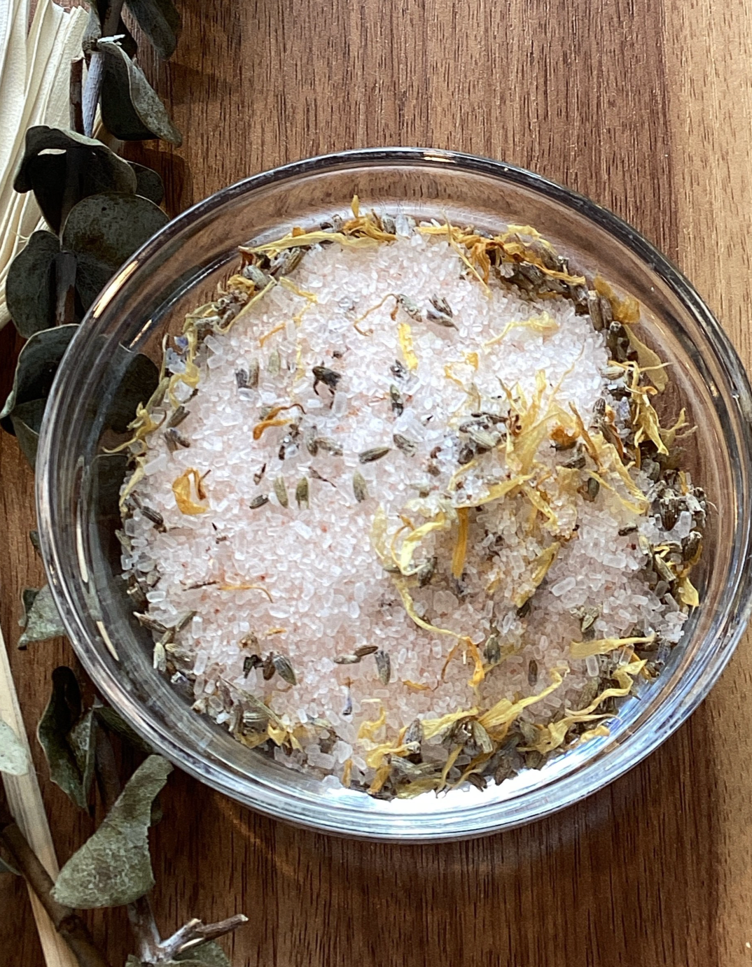 Ingredients: Epsom Salt, Himalayan Pink Salt, Petals of Lavender and Calendula, Lavender Essential Oil