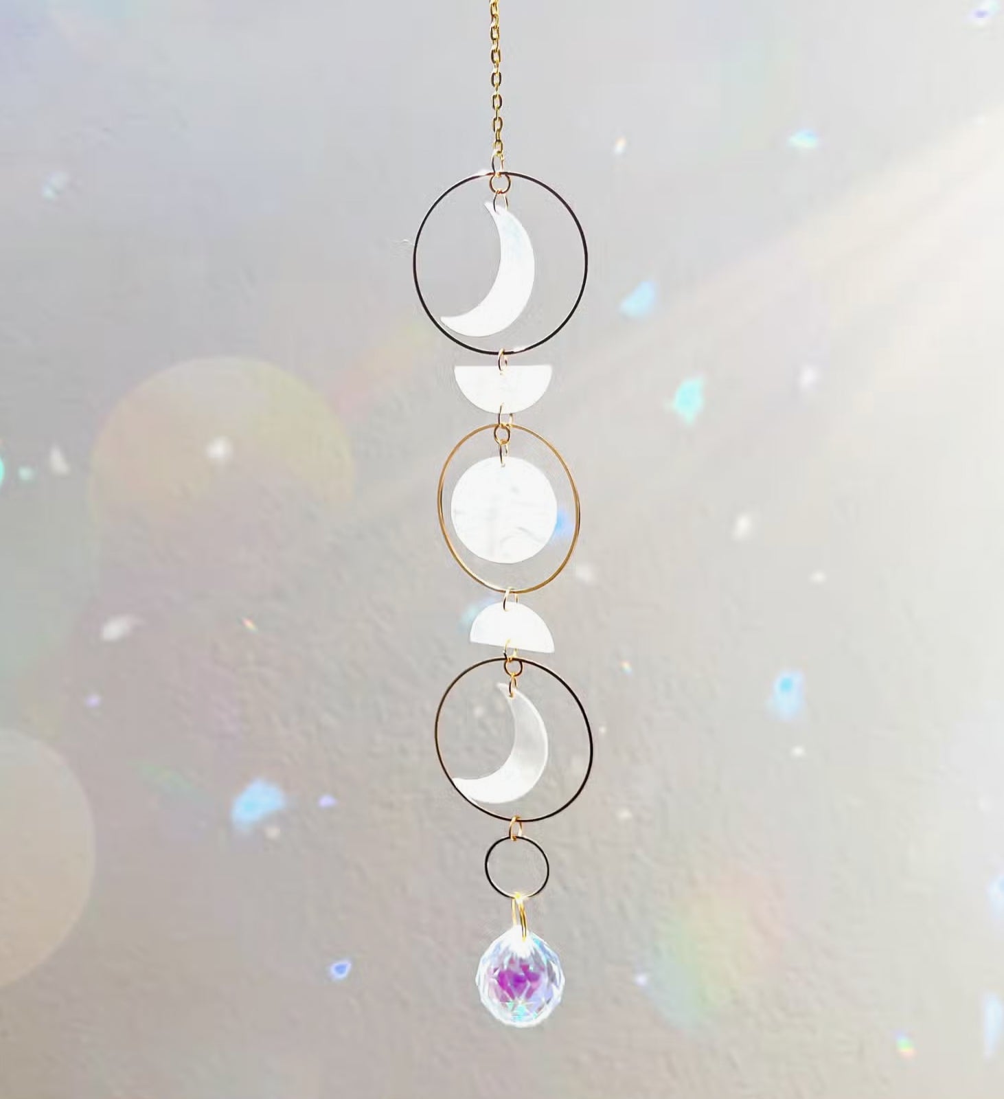 This crystal sun catcher will fill a room with rainbow prisms when it catches the sunlight. Hang this beautiful crystal sun catcher near a window. The Suncatcher features wire circles, encircling the moon phases and a drop prism. Moons have a shiny Lucite appearance. Suncatchers are for indoor use only.