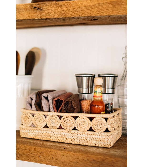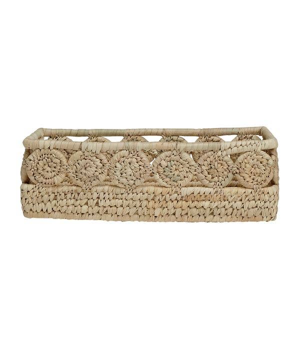 An ideal bread basket, Palm Medallion Bread Basket adds a functional piece to a beautiful tablescapes. Artisans collect palm leaves and separate the palm leaf fiber which they wash and leave to dry in the sun. It is then ready for weaving. Palm leaf