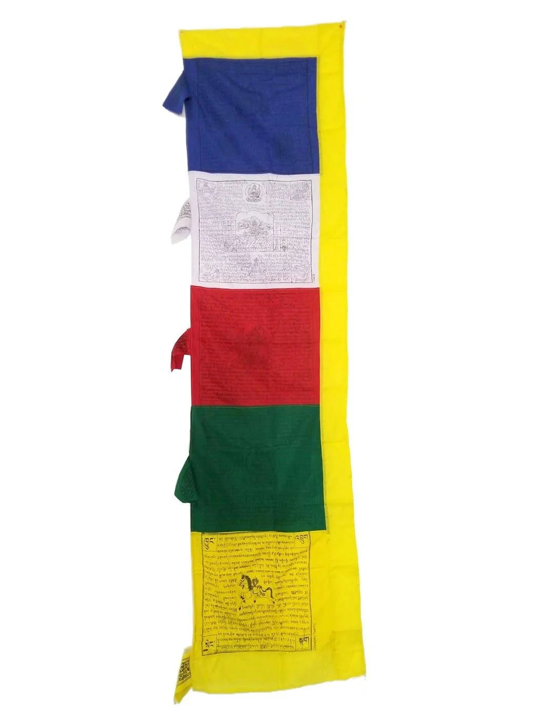 This fluttering prayer flag is made of colorful cotton cloth squares in white, blue, yellow, green and red colors, each with mantras and prayers, and connected by a string along their top edges . It is believed, by hanging them, prayers will be blown upwards as offering to their deities and will bring peace, happiness and good health to all who hang them as well as all who are touched by the wind.